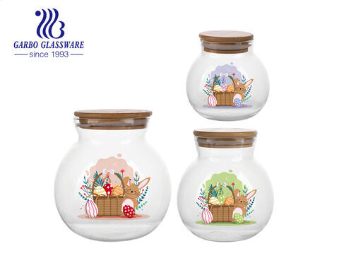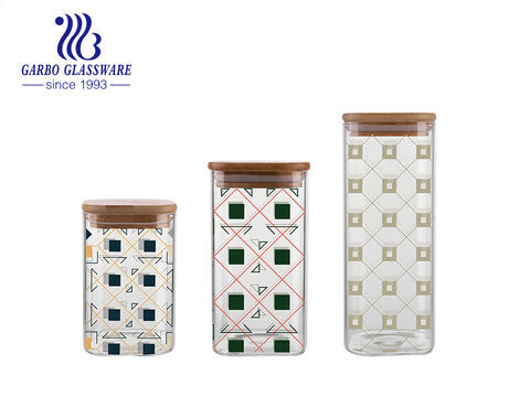 High borosilicate irregular glass storage jar with customized decal designs bamboo lid